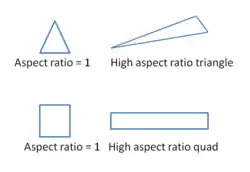 It is the ratio of longest to the shortest side in a cell. Ideally it should be equal to 1 to ensure best results. For multidimensional flow, it should be near to one. Also local variations in cell size should be minimal, i.e. adjacent cell sizes should not vary by more than 20%. Having a large aspect ratio can result in an interpolation error of unacceptable magnitude.