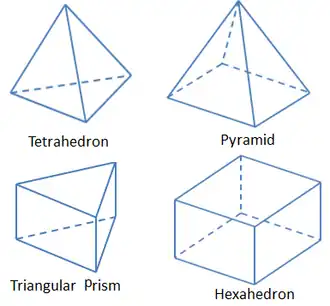 The basic 3-dimensional element are the tetrahedron, quadrilateral pyramid, triangular prism, and hexahedron. They all have triangular and quadrilateral faces.