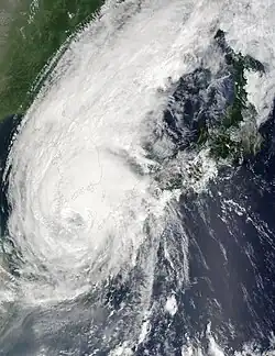 While at peak intensity, Rusa struck the Japanese island of Amami Ōshima.[6] After maintaining the peak winds for about 12 hours, Rusa weakened slightly as it continued to the west-northwest, but on August 28 the JMA again reported the typhoon attained winds of 150 km/h (90 mph 10 minute sustained).[2] Despite forecasts that it would weaken, Rusa maintained its intensity while passing south of Japan, due to minimal wind shear and warm sea surface temperatures of up to 29 °C (84 °F).[4] The typhoon again weakened slightly on August 29 while passing between the Amami Islands and Japan. Thereafter, Rusa turned to the north toward the Korean Peninsula.[2] Warm, moist air blew across the peninsula ahead of the storm, which prevented significant weakening, and an approaching cold front contributed to atmospheric instability.[4] At around 0800 UTC on August 31, Rusa made landfall on Goheung, South Korea, with winds of 140 km/h (85 mph 10 minute sustained).[2][4] According to the JTWC, Rusa was the most powerful typhoon to hit the country since 1959.[3] The typhoon rapidly weakened while crossing the country, deteriorating into a tropical depression early on September 1.[2] Around that time, the JTWC issued its last advisory on the system.[3] The depression turned to the northeast, and after moving through the Sea of Japan, Rusa became extratropical over Primorsky Krai in the Russian Far East late on September 1. The extratropical remnants continued northeast and dissipated on September 4 over the Kamchatka Peninsula.[2]