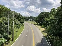 Upon splitting from U.S. Route 206, U.S. Route 202 heads north on Somerville Road, a two-lane undivided road. It soon meets County Route 523 (Main Street), and U.S. Route 202 makes a right turn to head to the northeast on Lamington Road.[1] The route heads east through residential areas and crosses the North Branch Raritan River into Far Hills. Upon entering Far Hills, the route intersects County Route 512 (Peapack Road), forming a concurrency that lasts with that route until County Route 512 heads south on Far Hills Road just before U.S. Route 202 crosses NJ Transit’s Gladstone Branch near the Far Hills Station. From here, the road heads northeast through wooded areas with some clearings and residences, crossing into Bernardsville.[1][3] In Bernardsville, U.S. Route 202 heads through rural areas with trees and fields as Mine Brook Road before reaching the town itself.[3] In the town, the route intersects County Route 525 (Claremont Road), briefly running concurrent with that route until it heads south on Mt. Airy Road. From the center of Bernardsville, U.S. Route 202 runs northeast as Morristown Road, crossing into Bernards Township, where it heads through wooded residential areas.[1][3] In the Franklin Corners section of Bernards Township, the road features an intersection with County Route 613 (Childs Road) and North Maple Avenue, the latter providing access to Interstate 287.[1]