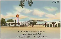 Though US 80 later took Pine Street through town and followed I-10 west towards Lordsburg, New Mexico. The roadbed of this route sometimes appears as frontage roads on the northern and southern sides of the Interstate. The older alignment followed Spruce Street west then took NM 418 out of town to Exit 62. Along I-10 heading west to Lordsburg, sections of old US 80 are sometimes visible on the northern side of the Interstate next to the railroad tracks. In Lordsburg, US 80 took Motel Drive through town before returning to the route of I-10. There are some old motels and businesses from the era of US 80 left within Lordsburg. An older abandoned US 80 is still visible between I-10 and the railroad tracks west of town.[3]