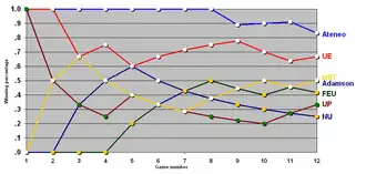 - UST clinched the #1 seed and the twice to beat advantage at the semifinals with a better points difference (+35) against FEU (–13) and Ateneo (–22)