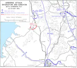 On 20 October the US 187th Airborne Regimental Combat Team (187th RCT) was parachuted ahead of the advancing UN spearheads into drop zones in Sukchon and Sunchon, 40 kilometres north of Pyongyang, with the objectives of cutting off the retreating KPA forces that were withdrawing up the west coast of the Korean Peninsula and releasing US and South Korean prisoners of war. Although the airborne drop itself was a success, the operation came too late to intercept any significant KPA elements and the US landings initially met little resistance. However, on 21 October as the 187th RCT began to advance south to the clear the Sukchon to Yongyu road towards Pyongyang the Americans came under heavy attack from the KPA 239th Regiment and requested assistance.[73]