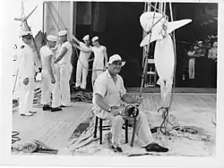 After a short cruise in Alaskan waters, the cruiser returned to Seattle and embarked the President again on 3 October for a vacation cruise to Cedros Island, Magdalena Bay, Cocos Island, and Charleston, South Carolina. Houston celebrated the opening of the Golden Gate Bridge at San Francisco on 28 May 1937, and carried President Roosevelt for a Fleet Review at the same city on 14 July 1938.[5] Roosevelt then began a 24-day cruise aboard Houston to fish the waters of the Galápagos Islands, concluding on 9 August 1938 at Pensacola, Florida.[6][7]