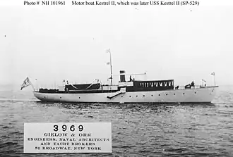 This article incorporates text from the public domain Dictionary of American Naval Fighting Ships. The entry can be found here.- Department of the Navy Naval History and Heritage Command Online Library of Selected Images: Civilian Ships: Kestrel II (Motor Yacht, 1912). Served as USS Kestrel II (SP-529) in 1917-1919