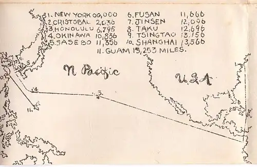 NOTE: The following may be called into question given the information in the images shown above in the 1945 Christmas card which depicts ports-of-call prior to the time the card was created. If the dating of the card is correct, the ports-of-call would have already been visited, whereas, if the following is correct, the card would have to been made with knowledge of ports not yet visited.
