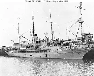 USS Owera in a United States East Coast port ca. 1918. Destroyer tender USS Prairie is across the pier.