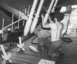 One 5 in (127 mm)/38 caliber dual-purpose gun was mounted on the stern. Anti-aircraft defense was provided by eight Bofors 40 mm (1.6 in) anti-aircraft guns in single mounts, as well as twelve Oerlikon 20 mm (0.79 in) cannons, which were mounted around the perimeter of the deck.[4] By the end of the war, Casablanca-class carriers had been modified to carry thirty 20 mm (0.79 in) cannons, and the amount of Bofors 40 mm (1.6 in) guns had been doubled to sixteen, by putting them into twin mounts. These modifications were in response to increasing casualties due to kamikaze attacks. Casablanca-class escort carriers were designed to carry 27 aircraft, but the hangar deck could accommodate more. During the Invasion of Lingayen Gulf, she carried 20 FM-2 Wildcat fighters, 11 TBM-3 Avenger torpedo bombers, and a TBM-3P photo reconnaissance plane for a total of 32 aircraft.[5] However, during the Battle of Okinawa, she carried 18 FM-2 fighters and 12 TBM-3 torpedo bombers for a total of 30 aircraft.[6]
