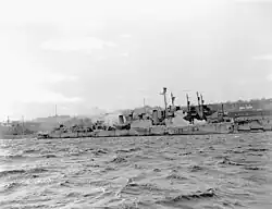 Leamington arrived at Devonport Dockyard, on 15 November, where she was refitted for Royal Navy service. After workup and training, the destroyer was allocated to the 2nd Escort Group, Western Approaches Command, based at Londonderry Port.[1] She conducted convoy escort missions across the Atlantic into 1941. On 28 April 1941, Leamington was one of three escorts detached from Convoy OB 314 to reinforce Convoy HX 121, under attack by German U-boats. When the corvette Gladiolus detected a submarine on her sonar, Leamington and sister ship Roxborough joined Gladiolus in attacking the contact. Although Gladiolus was credited with sinking the submarine, post-war analysis showed that the submarine, U-96 was undamaged.[2][3] On 27 May 1941, Leamington was part of the escort of Convoy OB 325 when she collided with the Norwegian merchant ship Thyra, which sank, killing five aboard the merchant ship.[1][4] Leamington was under repair at Liverpool until July that year, when she rejoined the 2nd Escort Group, which moved to Iceland in September.[5] On 11 September, the 2nd Escort Group, including Leamington was sent to reinforce Convoy SC 42 under heavy attack off the east coast of Greenland from the U-boats of the wolfpack Markgraf, which had sunk 15 ships from the convoy already. On the afternoon of 11 September, Leamington and the destroyer HMS Veteran were sent ahead of the convoy to investigate a sighting by an aircraft of a submarine ahead of the Convoy. The two destroyers spotted U-207 on the surface and carried out a series of depth charge attacks against the submarine, which was destroyed with no survivors.[6][7]