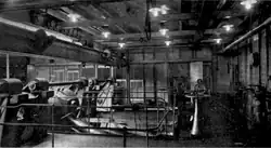 Propulsion was by an inclined, three-cylinder steam engine below the main deck with only the main bearing tops, upper parts of the valves and handling levers above the main deck.[3] The engine was unique in using a Walschaert gear, normally used on locomotives, to drive a Corliss gear for the two low-pressure cylinders and the poppet type valves on the high-pressure portion.[20] The speed guarantee of 22 miles per hour (35.4 km/h; 19.1 kn) was met by the engine's 12,000 ihp (8,900 kW) at 31 revolutions per minute.[3][note 3] The high-pressure cylinder, 66 in (167.6 cm) in diameter, was centered between the two low-pressure cylinders of 96 in (243.8 cm) diameter with steam provided by six single ended and three double ended Scotch boilers forward of the engine room delivering steam at 165 psi (1.1 MPa).[3] The single ended boilers were 14 ft (4.3 m) inside diameter by 10 ft 6 in (3.2 m) length and the double ended boilers were 14 ft 2.1875 in (4.3 m) mean diameter by 20 ft 5.5 in (6.2 m) length.[3] The two 32 ft 9 in (10.0 m) diameter paddle wheels each had eleven steel buckets 14 ft 10 in (4.5 m) long by 5 ft (1.5 m) wide.[3] Due to the restricted channels at both Cleveland and Buffalo additional maneuvering capability was required and a bow rudder and steam steering engine were provided.[3]