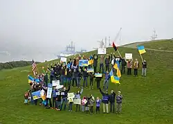 The 2014–15 Russian military intervention in Ukraine compelled many UAWS members to engage in political activities. In 2014, the association formed a political committee.[47] The committee regularly organized protest rallies in Seattle to stop Russian aggression, free Nadiya Savchenko, and persecute the murderers of Boris Nemtsov, a notorious critic of Russian military intervention into Ukraine.[47][48] Sometimes these rallies were joined by Russian local activists who also protested against Putin's policies.[47] UAWS is believed to be in the top 20 most politically active Ukrainian organizations in United States.[49]