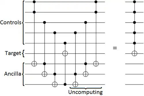 Uncomputation is a technique, used in reversible circuits, for cleaning up temporary effects on ancilla bits so that they can be re-used.[1]