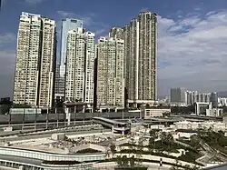 The Sorrento (Chinese: 擎天半島; Jyutping: king4tin1 bun3dou2; Cantonese Yale: Kìhngtīn Bundóu) is a residential complex occupying the northern edge of Union Square.[24] The complex serves as the phase 2 of the development plan and was built by The Wharf Estate Development Ltd. and MTR Corporation. It contains five residential towers completed in 2003 and was designed by Wong & Ouyang (HK) Ltd.