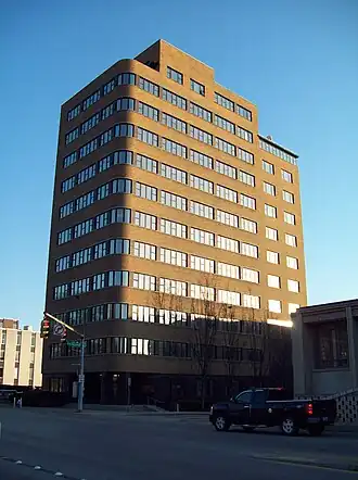 United Carbon Building, also known as Boulevard Tower, Stanley Building, and Nelson Building, is a historic office building located at Charleston, West Virginia. It is a 12-story, steel-framed building sheathed in a smooth, unornamented shell of gold-colored brick, black steel and glass. Its slender volume rises 157 feet from the sidewalk to the twelfth-floor penthouse, which once served as the office of the building's prominent patron, Oscar Nelson (1879-1953). Mr. Nelson, president of the United Carbon Company, commissioned architect Walter F. Martens to design the structure. The building was commissioned in 1939 as the national headquarters for the United Carbon Company, which occupied the ninth through the twelfth floors until 1950.[2]
