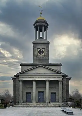 The 1828 church is constructed of locally quarried granite, and is one of the finest Greek Revival church buildings in New England. It has a Greek temple front, supported by four monolithic granite columns which may have been the largest set in the United States at the time. Each column is 25 feet (7.6 m) tall and weighs an estimated 25 tons. Above the main facade rises a two-stage tower. Its lower section is oblong and unadorned, while the second stage is stepped back and square. It has clock faces on each side, and is topped by an open cupola with eight columns and a dome.[2]