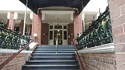 The front entry to Montpelier is accessed via a set of masonry stairs and a ground floor verandah. This verandah has an ochre, yellow and grey terrazzo floor with brass strips and the lettering "USC". The centrally located entrance lobby opens to lounge areas on the west and east sides of the building. These lounges have bay windows overlooking the front verandah, and fireplaces located on the extreme east and west walls. The hall leads to another lounge area and through to the dining room. The dining room extends east behind the Green House. Pressed metal ceilings are located in the lounges and the dining room. A kitchen and offices are located to the rear of Montpelier on this level. Four sets of stairs provide access to the basement level, and/or the level above. The main stair, located behind the front, western lounge, is decorated with a leadlight window. Bathroom facilities, containing early fittings, are located along the western side of this level. Access to the Green House is gained via two lounge areas on the eastern side of Montpelier.[1]