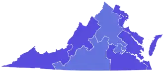 Robb placed first in all of Virginia's congressional districts. The third, fifth, and seventh congressional districts were the only districts that Dawkins received more than 30% of the vote in.[4] Robb received around 70% of the white vote while the overall composition of his voters were 78% white and 12% black compared to Dawkin's 94% white and 6% black. Robb is one of the few Democrats to have won a majority of the white vote after 1969.[5]
