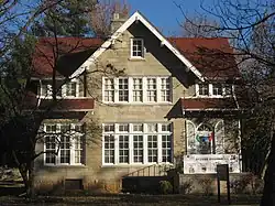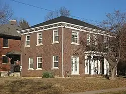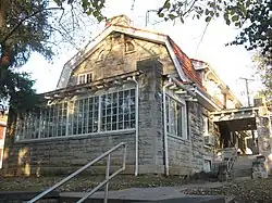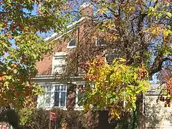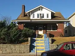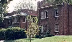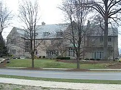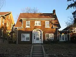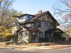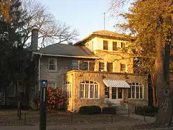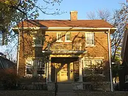 The Sigma Chi house at 601 E. Seventh Street, built in Free Classic style, was enlarged in 1925 by Granger, Lowe & Bollenbacher in a manner sympathetic to the original design.[3]
