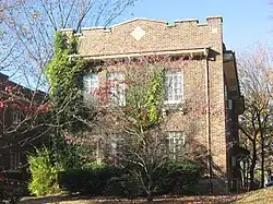 The northeast corner of Indiana Avenue and Eighth Street was originally the site of a Tudor Revival house built by Maude Showers. Situated on three lots and designed by Carlisle Bollenbacher, the house was sold to Delta Tau Delta and used for a fraternity until destroyed by fire in February 1935. The fraternity rebuilt on the same site. The new house was designed by Burns & James and retained the same placement on the three lots as the original house. The general contractor was Charles A. Pike.[4][5]