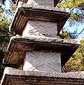 This stone pagoda is situated just in front of the Seated Stone Buddha with Nimbus. The pagoda base is a large square stone. The appearance of this pagoda follows the traits of the Silla pattern, but the body stones of the pagoda wear unique patterns - crossing "X" markings on the face and diamond "<>" markings on the corners, not found on other domestic stone pagodas. The pagoda is 7.75m/25.4 ft high. This is Tangible Cultural Property #277.