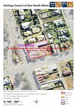 - ^ a b c d e f g h i j k l m n o p q r s t u v w x y z aa ab ac ad ae af ag ah ai aj ak al am an ao ap aq ar as at au av aw ax ay az ba bb bc bd be bf bg bh bi bj "Up-To-Date Store and Garth Jones Collection of farm machinery". New South Wales State Heritage Register. Department of Planning & Environment. H01761. Retrieved 2 June 2018.