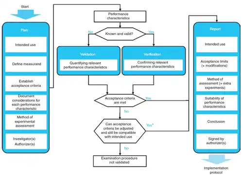 - ^ a b c Roelofsen-de Beer R, Wielders J, Boursier G, Vodnik T, Vanstapel F, Huisman W; et al. (2020). "Validation and verification of examination procedures in medical laboratories: opinion of the EFLM Working Group Accreditation and ISO/CEN standards (WG-A/ISO) on dealing with ISO 15189:2012 demands for method verification and validation". Clin Chem Lab Med. 58 (3): 361–367. doi:10.1515/cclm-2019-1053. hdl:2066/217437. PMID 31714885.