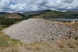 Trees were cleared for the reservoir by the Civilian Conservation Corps.[4] The earthen dam was constructed in 1940 by the United States Bureau of Reclamation, with a height of 162 feet (49 m), and a length at its crest of 4,010 feet (1,220 m).[3] It impounds the Los Pinos River for irrigation water storage. The dam is owned by the Bureau and is operated by the local Pine River Irrigation District.