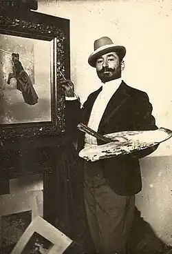 Vardges Sureniants was born in Akhaltsikhe, Russian Empire in modern-day Georgia on 27 February 1860.[3] His father, Hakop Sureniants, was a priest and taught religious history.[4] He and his wife, Ustine Sureniants, had five children— four sons and one daughter, with Vardges being the youngest.[5] The Sureniants family moved to Simferopol in 1868. As a family passionate about art, the Surenyants receive a warm welcome from a noble seascape painter Hovhannes Aivazovsky in Simferopol. Around 1868, young Vardges Surenyants joined a travel journey to Bakhchisaray with Aivazovsky’s family, returning full of impressions. He admired the Zuruck Su River, the halls of Abdul Sakhal Girei Khan’s palace, the gardens and the marble fountains. He was especially fascinated with the famous Fountain of Tears, which he later sketched at home with a pencil. That very drawing impressed the famous seascape painter Aivazovsky, who saw a great potential and talent in the young artist’s work. For his drawing, young Vardges Surenyants receives great encouragement from Aivazovsky, who gives him a set of paints as a gesture of support.[6][5] Sureniants' father was then appointed a presbyter to the Armenian diocese in Moscow. Until the age of 10, Vardges Surenyants did not attend school in either Crimea or Akhaltsikhe. However, by that time, he had gained considerable knowledge in the humanities for his age. He was fluent in both Armenian and Russian, with his proficiency in Armenian being largely attributed to his father.[5] When in Moscow, Sureniants had an opportunity to study at the prestigious Armenian Lazarian School located in the city.[3] On 13 June 1875, the pedagogical council of the Lazarian Seminary decided to award Vardges a scholarship in recognition of his artistic talent, and grant him a place at the prestigious Moscow School of Painting, Sculpture, and Architecture, a leading institution in Russian artistic circles at the time. He began his studies there in 1876 and graduated in 1879.[6] In 1878, after losing his scholarship, Surenyants’s father decided to send him abroad (Stuttgart) to study at the esteemed institutions in Munich Polytechnic. In 1880, after selling a large composition piece (name unknown) for 800 Marks at a student exhibition, Surenyants took a risk and left the Polytechnic Institution after his second year and was admitted to the Academy of Fine Arts, where he studied in the studio of German painter Otto Zeyt, receiving more education in painting and ultimately graduating from the academy in 1885.[3][7] His father was deeply shocked by this decision and tried everything in his power to change his mind.[6] "I am a painter, and I don’t want to fall behind in two things. I don’t want to be a dilettante in painting. Finally, I do not have the sympathy and strong aspiration for architecture to be able to overcome the difficulties created for me and finish", said he to G. Khalatyan, who visited him at his father’s request to convince him to abandon painting.[6] In 1886, Surenyants traveled extensively to Iran and the South Caucasus. By 1892, he settled in Moscow, where he established his life and career.[6]