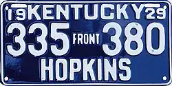| 1929 | Pair of plates with blue base with white embossed lettering and border. Front: top of plate emblazoned with "19 KENTUCKY 29" with county name at bottom. Serial numbers in center separated by "FRONT" in small letters in middle. Rear: top of plate emblazoned with "19 KENTUCKY 29" with "FOR" in center of plate between serial numbers and "PROGRESS" emblazoned at bottom. | "FOR PROGRESS" on rear plates (see left) | 123-456 | 1 to 850-000 (see right) | A block of serials was assigned to each county in alphabetical order; this practice continued through 1936.[2] |