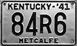 | 1941 | Embossed black serial on silver plate with border line; "KENTUCKY-'41" and county name centered at top and bottom respectively | none | 12345 A1234 1A234 12A34 123A4 | Issued in blocks by county | ||