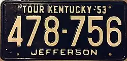 | 1953 | Embossed white serial on dark blue plate; county name centered at bottom | "TOUR KENTUCKY-'53" centered at top | 123-456 | Issued in blocks by county | ||