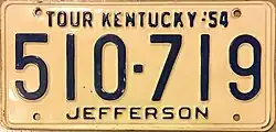 | 1954 | Embossed dark blue serial on white plate; county name centered at bottom | "TOUR KENTUCKY-'54" centered at top | 123-456 | Issued in blocks by county | ||