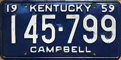 | 1959 | Embossed white serial on dark blue plate; "19 KENTUCKY 59" at top; county name centered at bottom | none | 123-456 A12-345 | Issued in blocks by county | ||