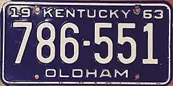 | 1963 | Embossed white serial on dark blue plate with border line; "19 KENTUCKY 63" at top; county name centered at bottom | none | 123-456 A12-345 | Issued in blocks by county | ||