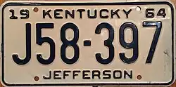 | 1964 | Embossed dark blue serial on white plate with border line; "19 KENTUCKY 64" at top; county name centered at bottom | none | 123-456 A12-345 | Issued in blocks by county | ||