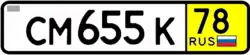 The current format uses a letter followed by 3 digits and two more letters. To improve legibility of the numbers for Russian cars abroad, only a small subset of Cyrillic characters that look like Latin characters are used (12 letters: А, В, Е, К, М, Н, О, Р, С, Т, У, Х), additionally D was issued on some very early plates.[1] Finally, the region number (77, 97, 99, 177, 197, 199, 777, 797 and 799 for Moscow; 78, 98, 178, and 198 for Saint Petersburg, etc.) and the international code RUS with the 1991 to 1993 Russian flag typically to the right of it, however the flag is not mandatory, and since 2013 owners may order plates without it.[2]