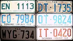 In the illustration of older Tasmanian registration plates, the three plates on the left side from top to bottom are EN-1113 (1998–2004 issue), CO-7984 (1970–1998 issue), WYG-734 (1954-1970 issue, non-reflective). The plates on the right side are domestic or semi-trailer as indicated by the second character "T". The red plate is a Tasmanian interstate plate, issued before the birth of the Federal Interstate Registration Scheme.