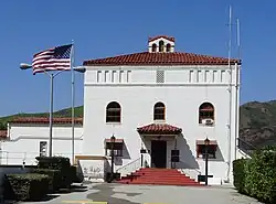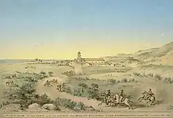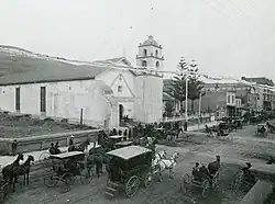 In 1769, the Spanish Portolà expedition, first recorded European visitors to inland areas of California, came down the Santa Clara River Valley from the previous night's encampment near today's Saticoy and camped near the outlet of the Ventura River on August 14. Fray Juan Crespi, a Franciscan missionary traveling with the expedition, noted that "we saw a regular town, the most populous and best laid-out of all that we had seen on the journey up to the present time."[20] Archaeological records found that the Chumash village they encountered was settled sometime around AD 1000. Junípero Serra, first leader of the Franciscans in California, founded Mission San Buenaventura in 1782 as his ninth and last mission established near the Chumash village as part of Spain's colonization of Alta California.[21] The mission was named for St. Bonaventure, a 13th-century Franciscan saint and a Doctor of the Church. San Miguel Chapel was the first outpost and center of operations while the first Mission San Buenaventura was being constructed. The first mission burned in 1801 and a replacement building of brick and stone was completed in 1809. The bell tower and facade of the new mission was destroyed by an 1812 earthquake.[22][23] The Mission was rebuilt and functions as a parish church.