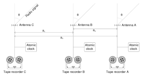 Each antenna will be a different distance from the radio source, and as with the short baseline radio interferometer the delays incurred by the extra distance to one antenna must be added artificially to the signals received at each of the other antennas. The approximate delay required can be calculated from the geometry of the problem. The tape playback is synchronized using the recorded signals from the atomic clocks as time references, as shown in the drawing on the right. If the position of the antennas is not known to sufficient accuracy or atmospheric effects are significant, fine adjustments to the delays must be made until interference fringes are detected. If the signal from antenna A is taken as the reference, inaccuracies in the delay will lead to errors and in the phases of the signals from tapes B and C respectively (see drawing on right). As a result of these errors the phase of the complex visibility cannot be measured with a very-long-baseline interferometer.