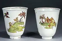 The great majority of wares are teaware: cups, saucers, teapots and a few small plates. Many cups are beakers without handles, and the teapots, which form an unusually large proportion of the surviving pieces, often have moulded shapes, including relief decoration. The bodies can be white, but often tend to grey; they are very translucent. The shapes often draw from silverware, but they are brightly painted in a variety of styles, influenced by the northern factories and Asian export wares.[4][5]