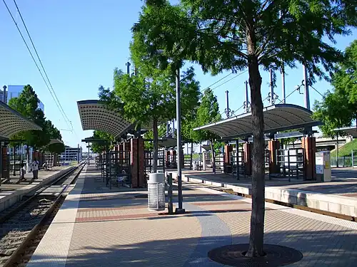 Victory station is a mass transit station in Dallas, Texas, United States. It serves the Trinity Railway Express commuter rail line, DART light rail trains, and DART buses. Located along the Stemmons Corridor in the Uptown neighborhood, the station opened in 2001 in the Victory Park development as a temporary platform shortly after the opening of the American Airlines Center.