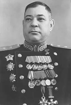 After Operation Barbarossa began on 22 June 1941, Baranov led the division as part of the 9th Army of the Southern Front in battles on the Prut in the area of Cahul, Fălciu, and Leovo, and conducted a fighting retreat to Kotovsk, Voznesensk, Novaya Odessa, and subsequently to the Dnieper, Novomoskovsk, Bogodukhov, Belgorod, and Korocha. He was promoted to major general on 24 July 1941.[4] In late October it was transferred to the vicinity of Moscow with the corps, fighting in the area of Serpukhov and Kashira during the Battle of Moscow. For its actions, the division became the 1st Guards Cavalry Division on 26 November, while the corps became the 1st Guards Cavalry Corps. At the end of January, the corps was sent on a raid into the German rear along the Warsaw Highway and for five months remained behind German lines in Smolensk Oblast together with airborne units. After returning to Soviet lines, Baranov became commander of the corps on 10 July 1942 and led it for the rest of the war.[2]Baranov led the corps as part of the Western, Southwestern, Voronezh, and 1st Ukrainian Fronts in the Voroshilovgrad Offensive, the Third Battle of Kharkov, the Donbass Offensive, the Battle of Kiev, and the Zhitomir–Berdichev, Rovno–Lutsk, Proskurov–Chernovitsy, Lvov–Sandomierz, Eastern Carpathian, Vistula–Oder, Lower Silesian, Upper Silesian, Berlin, and Prague Offensives. He was promoted to lieutenant general on 15 September 1943.[5] The corps was particularly distinguished in the capture of Zhitomir on 13 November 1943, receiving the name of the city as an honorific, and Baranov received the Order of the Red Banner for his leadership. During the Lvov–Sandomierz Offensive in July and August 1944, Baranov commanded a cavalry-mechanized group composed of his corps and the 25th Tank Corps.[6] 1st Ukrainian Front commander Marshal of the Soviet Union Ivan Konev described him as a "brave and strong-willed general" in a December 1944 assessment, but tempered his praise by noting that Baranov was "insufficiently decisive and only fulfilled his assigned missions with the prodding of the front military council" during the Lvov–Sandomierz Offensive.[3] For "successful completion of combat missions and the high combat efficiency of the corps," Baranov received the title of Hero of the Soviet Union and the Order of Lenin on 29 May 1945.[2]