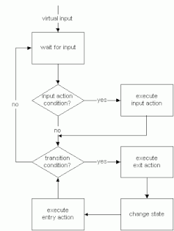 The input names build virtual conditions to perform state transitions or input actions. The virtual conditions are built using the positive logic algebra. The output names trigger actions; entry actions, exit actions, input actions or transition actions.