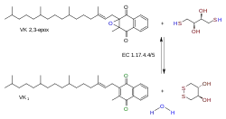 - ^ Rishavy MA, Usubalieva A, Hallgren KW, Berkner KL (March 2011). "Novel insight into the mechanism of the vitamin K oxidoreductase (VKOR): electron relay through Cys43 and Cys51 reduces VKOR to allow vitamin K reduction and facilitation of vitamin K-dependent protein carboxylation". The Journal of Biological Chemistry. 286 (9): 7267–78. doi:10.1074/jbc.M110.172213. PMC 3044983. PMID 20978134.