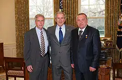 In March 2007 Shamanov met in the White House with the U.S. President George W. Bush, which was criticised by human rights groups.[18][21][22][23] "This isn't someone the U.S. president should be meeting with. This is someone the president should be calling for an investigation of," HRW commented.[24] Later, the White House explained that it was not aware of the allegations against the general before their meeting and that it is "unlikely" that Bush would have meet and pose to photo with Shamanov if he had been aware of the allegations.[25]