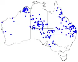The species is found on the edges of swamps and creek beds and damp flats in the Kimberley region of Western Australia where it grows in sandy-loam soils.[3] In the Territory it is found on mulga-dominated plains, alluvial plains and intermittent watercourses.[5]