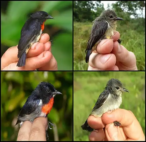 Wakatobi flowerpeckers exhibit sexual dimorphism. Males have dark gray feathers on the back and tail, white feathers on the belly, and red feathers on the chin. Females have medium gray feathers on the back and tail and light gray to white feathers on the belly and chin. Compared to the closely related grey-sided flowerpecker, the Wakatobi flowerpecker is significantly larger: it has longer wings, a longer bill, a longer skull, and is heavier. Additionally, there are subtle color variations: compared to the grey-sided flowerpecker, male Wakatobi flowerpeckers have bluer upper feathers, lighter side feathers, and their red coloring extends further down. For females there are no major color differences between the two species.[1] The species feeds primarily on fruit.[1]