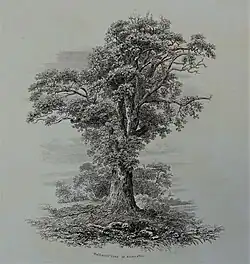 The tree is described in a book of 1857 as bearing "the mark of great age", though the writer notes that it was still in good health and "supporting a progeny of spreading branches".[5] A 1912 work described the Wallace Yew as being more than 600 years old and playing a key role in preserving the association of Wallace's name with the village; this being a period between the felling of the Wallace Oak and the erection of a granite monument to Wallace.[6]