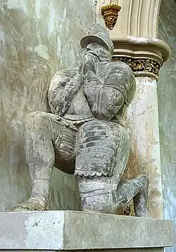 - Thomas Erle (d.1597), eldest son,[14] whose large effigy dressed in full-armour and kneeling on one knee in prayer, survives (re-positioned) in St Mary's Church, Morden, Dorset, the parish church of Charborough House. In 1581 at Shute in Devon, he married Dorothy Pole, a daughter of his father's near neighbour William Pole (1515–1587), Esquire, MP, of Shute House in the parish of Shute, near Colyton, Devon. Dorothy's brother was the Devon antiquary and historian Sir William Pole (1561–1635) whose principal seat was Colcombe House in the parish of Colyton, the former residence of Walter Erle of which mansion house and deerpark a lease had been granted to him by the Queen Katherine Parr. Pole describes various of the Erle family's landholdings in his work Collections Towards a Description of the County of Devon.[26] Dorothy's mother was Katherine Popham (died 1588), the sister of John Popham (1531–1607), Lord Chief Justice. Dorothy survived her husband and remarried to Sir Walter Vaughan (c.1572–1639), of Falstone (alias Fallersdon) in the parish of Bishopstone, Wiltshire, Sheriff of Wiltshire in 1599–1600 and a Member of Parliament for Wiltshire in 1606.[27] Thomas Erle commenced building a pier at Axmouth,[28] which manor had been acquired by his father. By his wife he had children including: