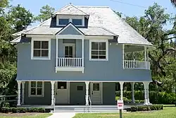 The twelve-room, 2+1⁄2-story cottage is slightly raised on footings. "The overhanging shingled volume of the second story is carried on slender, turned porch posts,"[10]: 306 creating a J-shaped covered porch beneath. The entrance is indicated by a Juliet balcony on the west façade, and the apsidal south façade features a peak-ceilinged semicircular sleeping porch on the second story.[10]: 344C To the east is a 2+1⁄2-story section containing the dining room and kitchen, with bedrooms and servant quarters above.
